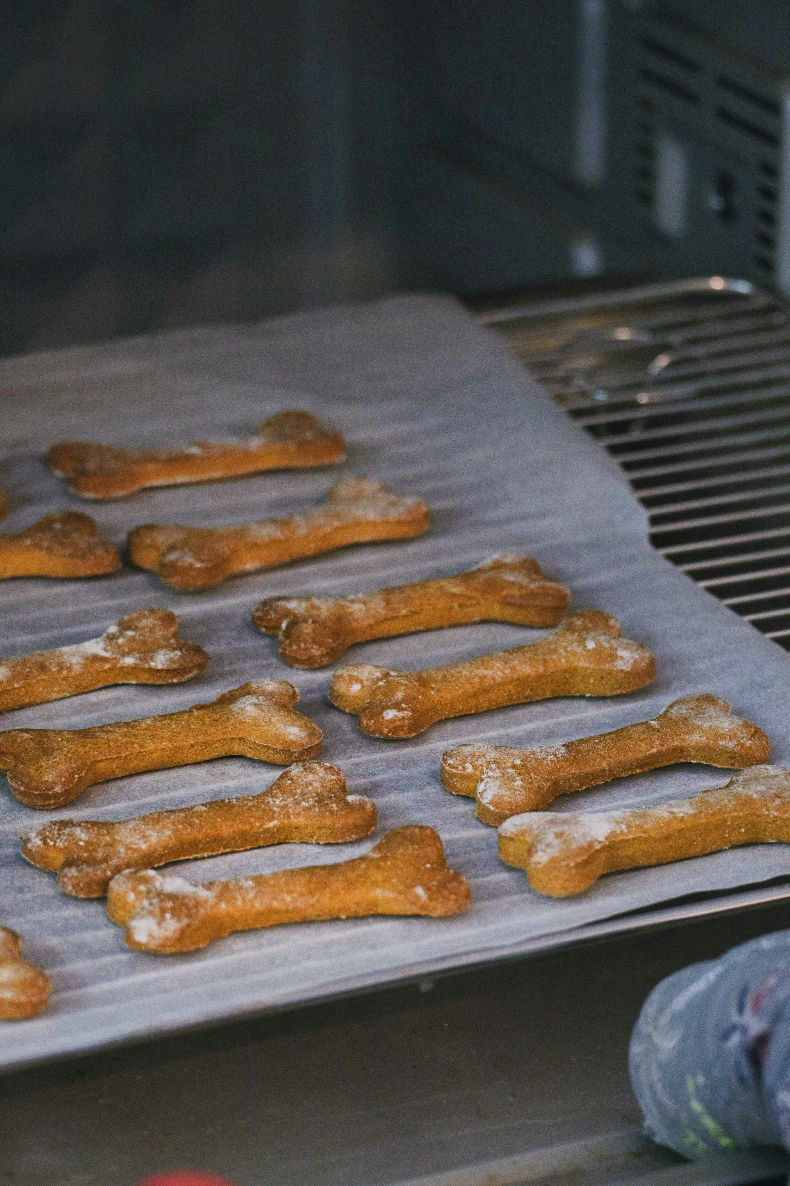 - Line a baking tray with grease-proof paper and place the treats on the tray before popping into the oven for about 20 mins until they are slightly brown and crunchy